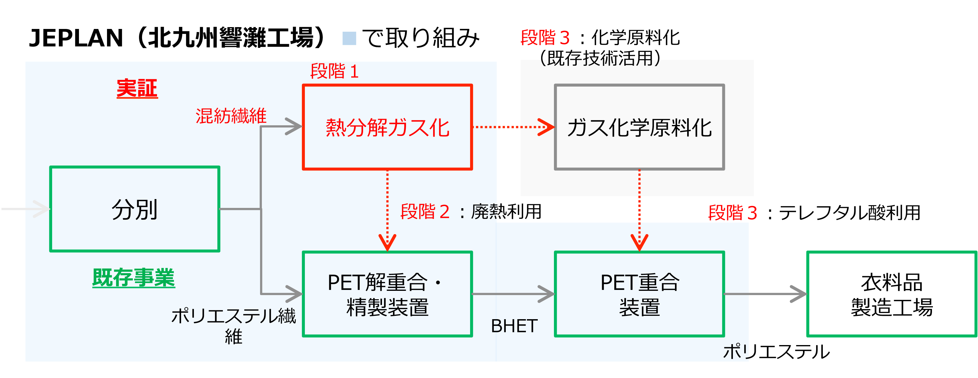 JEPLANは、日立造船株式会社(取締役社長兼CEO:三野禎男)の協力を得て、混紡繊維の熱分解ガス化の実証を北九州響灘工場(福岡県北九州市若松区響町1-120-6)にて実施します。循環を実現するためには段階的な実証が必要となりますが、最終的には、使用済衣類から得られたガスを再生ポリエステルの原料として利用することを目指します。なお、本実証は「北九州市環境未来技術開発助成制度」の令和5年度対象テーマとして採択されました。