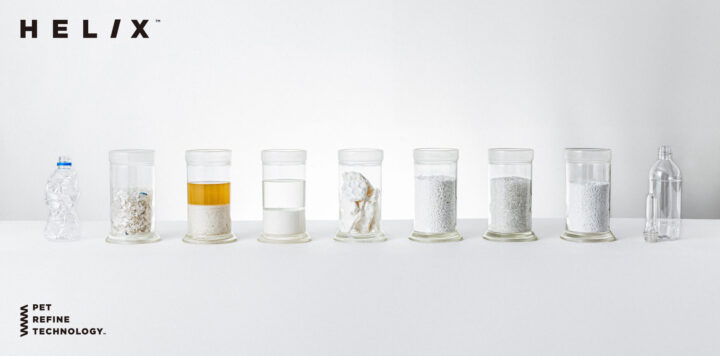 「HELIX」は、使用済みPETボトル等を主な原料に、独自のPETケミカルリサイクル技術を用いて製造される再生原料です。PETを分子レベルに分解し、不純物や色素などを取り除くことで、石油由来のPET樹脂と同等の品質を実現しています。そのため、飲料用PETボトルや化粧品容器など、高い品質基準が求められる用途にも使用することが可能です。また、石油由来の製造プロセスと比較してCO₂排出量の削減に寄与*1するなど、環境負荷の低減にも貢献します。