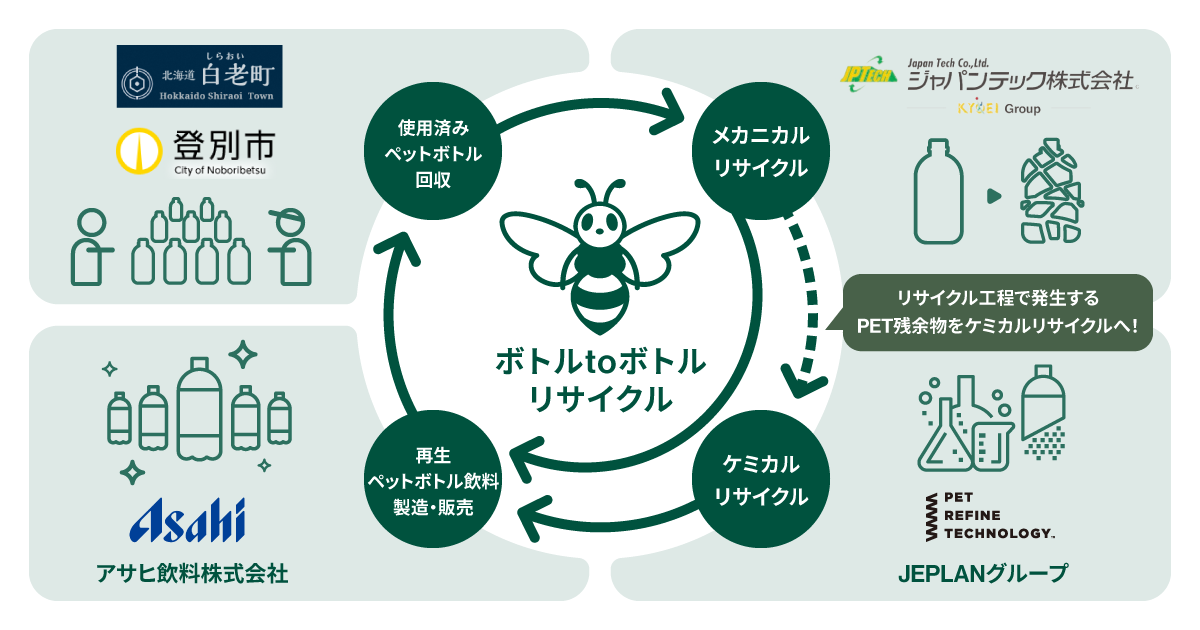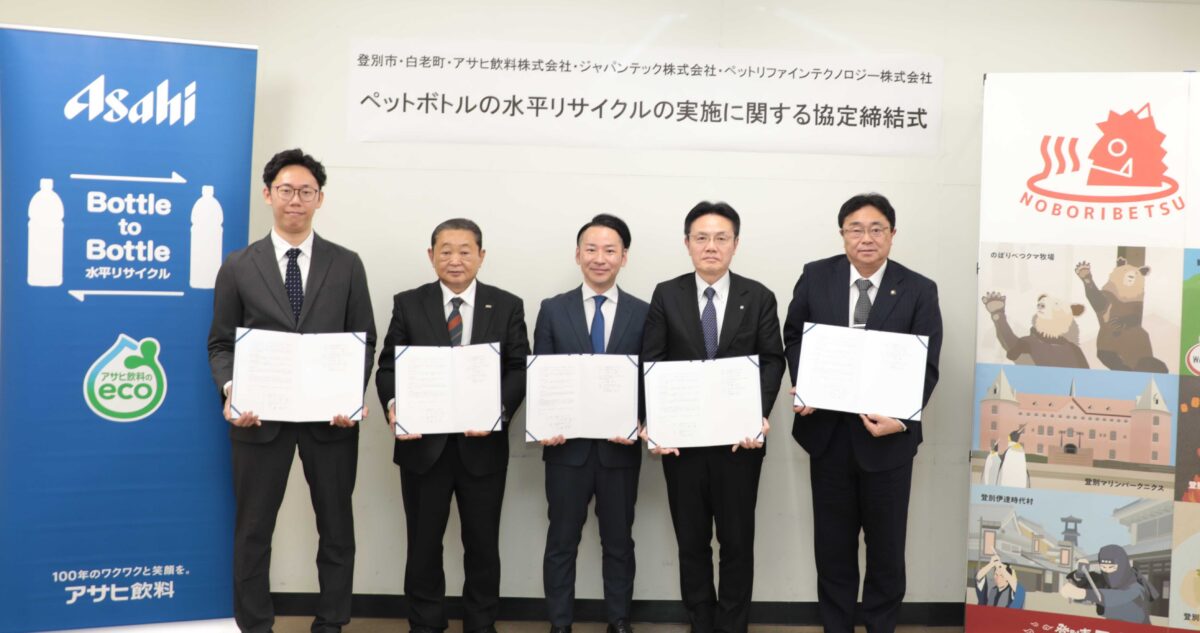 株式会社JEPLAN(代表取締役 執行役員社長:髙尾 正樹、以下「JEPLAN」)のグループ会社であるペットリファインテクノロジー株式会社(代表取締役 執行役員社長:伊賀 大悟、以下「ペットリファインテクノロジー」)は、登別市(市長:小笠原 春一)、白老町(町長:大塩 英男)、アサヒ飲料株式会社(代表取締役社長:米女 太一、以下「アサヒ飲料」)、ジャパンテック株式会社(代表取締役社長:古澤 栄一、以下「ジャパンテック」)、とともに、日本国内のPETボトルの循環利用の推進を目的とした「ペットボトルの水平リサイクルの実施に関する協定書」を2月12日(木)に締結しました。また、同日に協定書に署名をする締結式を行いましたので、お知らせします。
