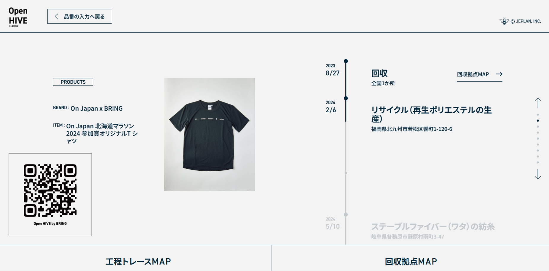 In addition, since the body of the T-shirt is made of recycled polyester resin, which is chemically recycled from some of the unwanted running clothes collected from last year's runners using JEPLAN's proprietary technology, the Circular Eco System Traceability System "Open HIVE by BRING," a circular eco-system traceability system, has been adopted, allowing visitors to read the QR code attached to the neck of the T-shirt to see where the clothing used as the raw material for the participation award T-shirt was collected, recycled, and manufactured. Once again this year, sportswear collection points will be set up during the event to collect sportswear not only from runners but also from visitors to the booth, and the front of the T-shirt will read "THIS T-SHIRT IS MADE TO BE RECYCLED. LIKE A GOOD RUN POWERS THE NEXT GREAT RUN, (This t-shirt was made to be recycled. (A good run will help the next great run)" is printed on the T-shirt, and we plan to continue our efforts to recycle clothing resources with the cooperation of runners and visitors for the next year.